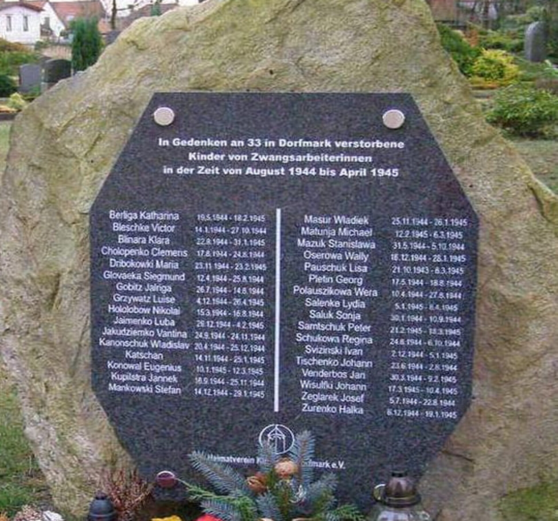 На кладбище Dorfmark покоится могила советского военнопленного, а также памятник в честь 33 умерших детей восточноевропейских работниц принудительного труда из места содержания иностранных детей Дорфмарк. У некоторых детей подтверждено польское происхождение, у остальных оно неизвестно. Могилы детей были сровнены с землёй в 1960-х годах, однако памятник сохраняет память о трагедии.