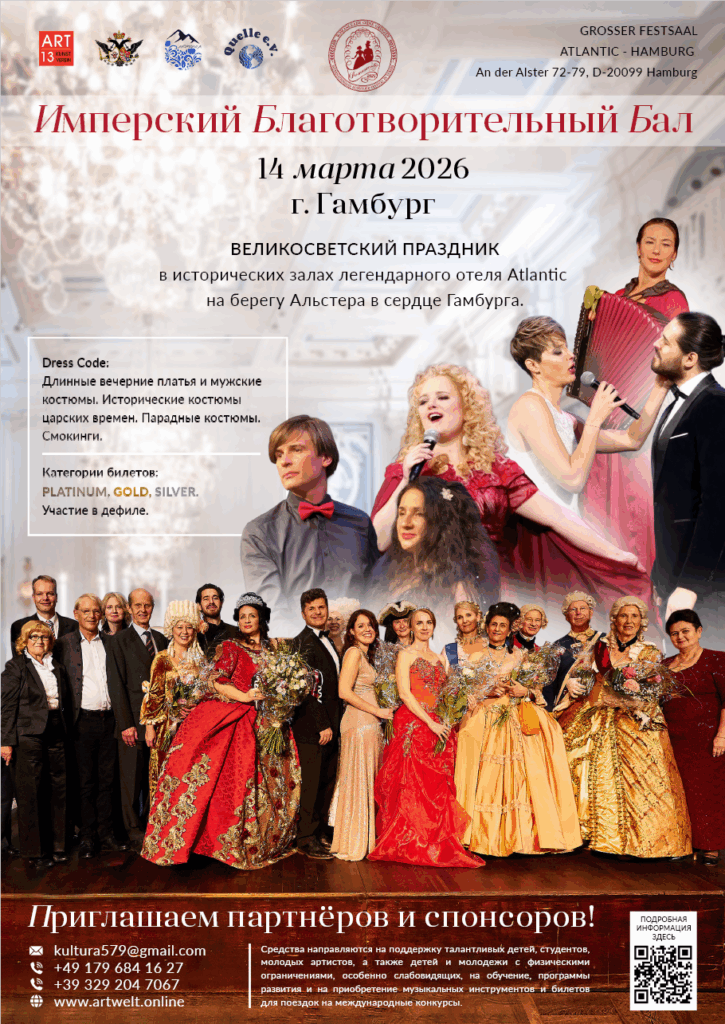 14 марта 2026 года в историческом Большом фестивальном зале Hotel Atlantic Hamburg пройдёт Imperial Charity Ball (КайзерБал) — светский благотворительный вечер с вальсом, живой музыкой и торжественным дресс-кодом. Начало в 18:00.