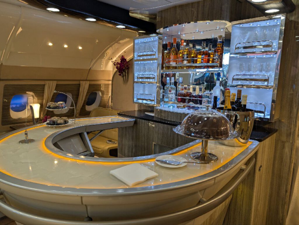 В отличие от предыдущих лет, стюардессы из Дубая на стенде также отсутствуют: вместо них на борту находится 20 человек из немецкого отдела продаж.