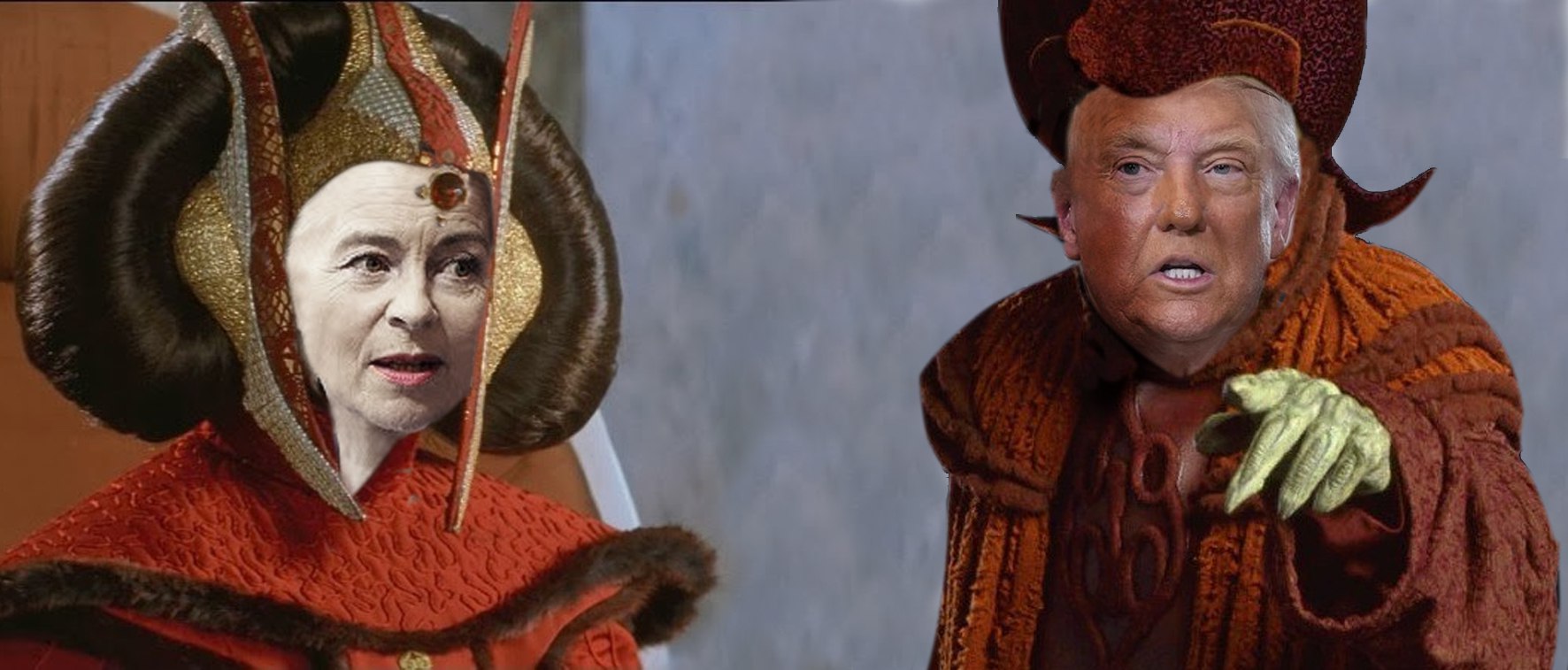 Fotos / Collage © Star Wars / Berliner Telegraph Vor dem Treffen mit der Präsidentin der Europäischen Kommission erklärte Donald Trump wie Qui-Go...